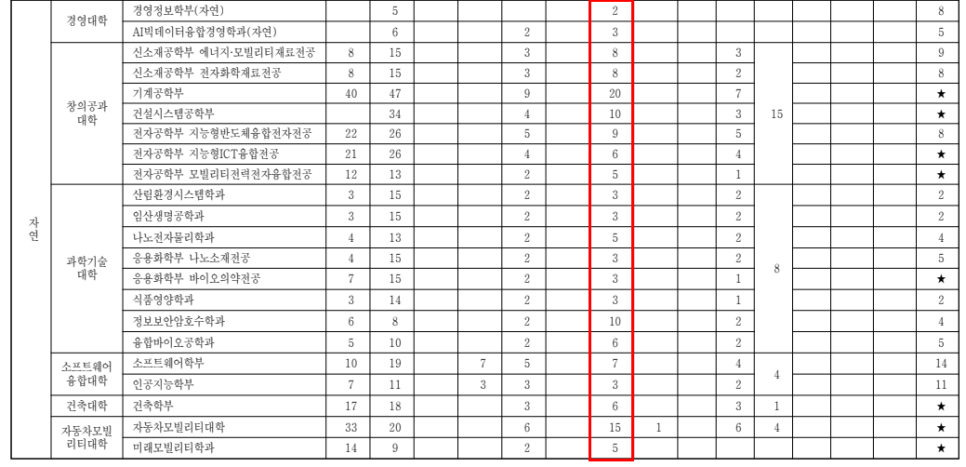 자연·공학계열은 모집 학과 수는 상대적으로 적지만 선발 인원이 많아요. 기계, 전자, 소프트웨어, 인공지능, 모빌리티 계열은 10~20명 이상 선발해요. 이 때문에 자연계열에서는 논술이 실질적인 합격 루트로 작동해요.