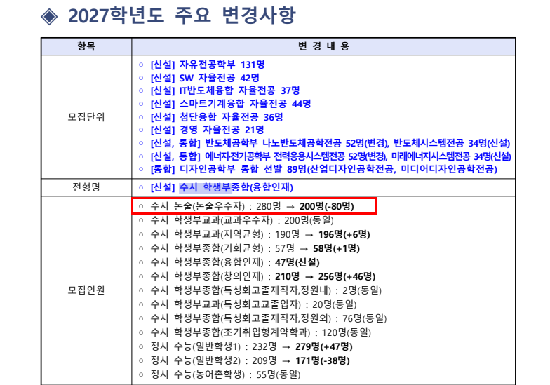 2027학년도에서 가장 먼저 짚어야 할 변화는 모집 인원 축소입니다.