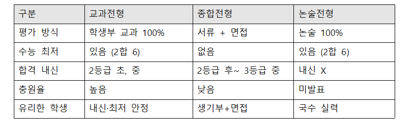 종합은 최저 부담은 없지만 서류와 면접이라는 불확실성이 존재하고, 교과는 최저와 내신을 동시에 요구합니다.