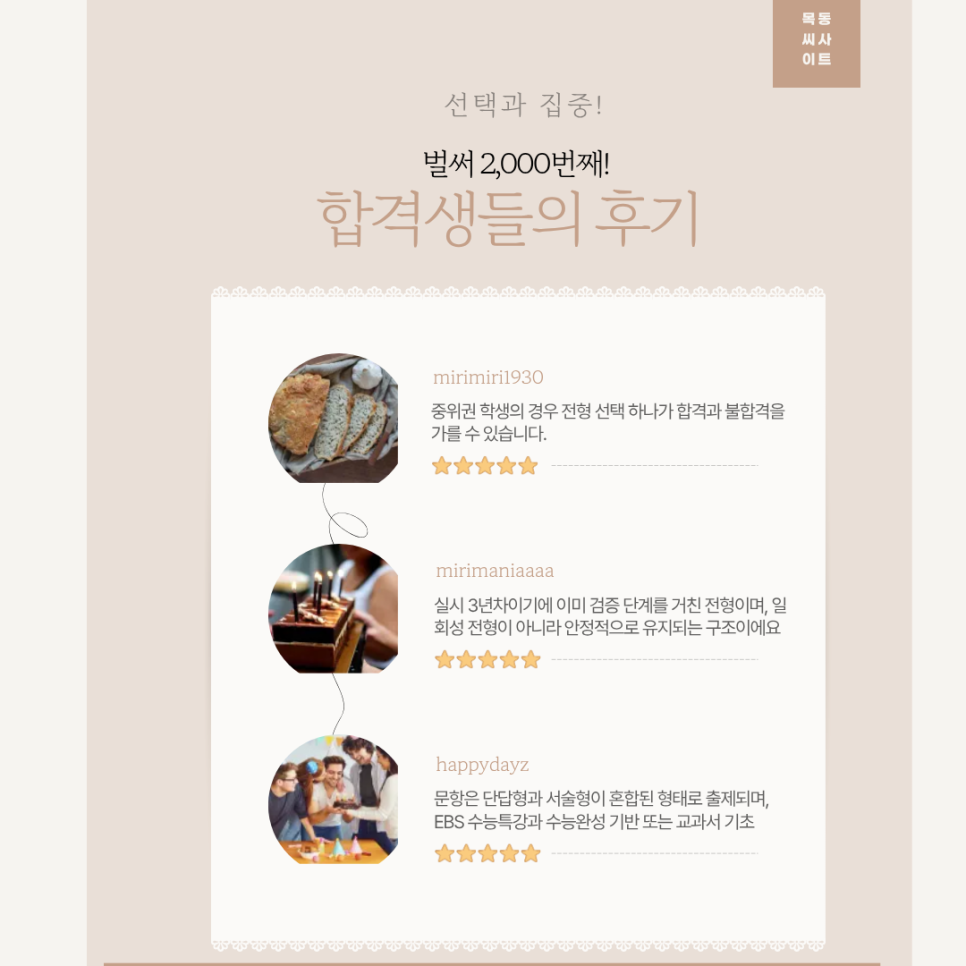 을지대는 교과 반영 비율이 20%로 신한대보다 높지만, 등급 간 점수 차이는 크지 않습니다. 실력으로 충분히 극복이 가능합니다. 실제로 내신 5~6등급 학생들의 역전 합격 사례도 꾸준히 나오고 있습니다. 다만 7~8등급 구간부터는 감점 폭이 커지므로 주의가 필요합니다. 기출 분석과 패턴 연구가 충분히 가능한 전형이라는 점도 강점입니다.