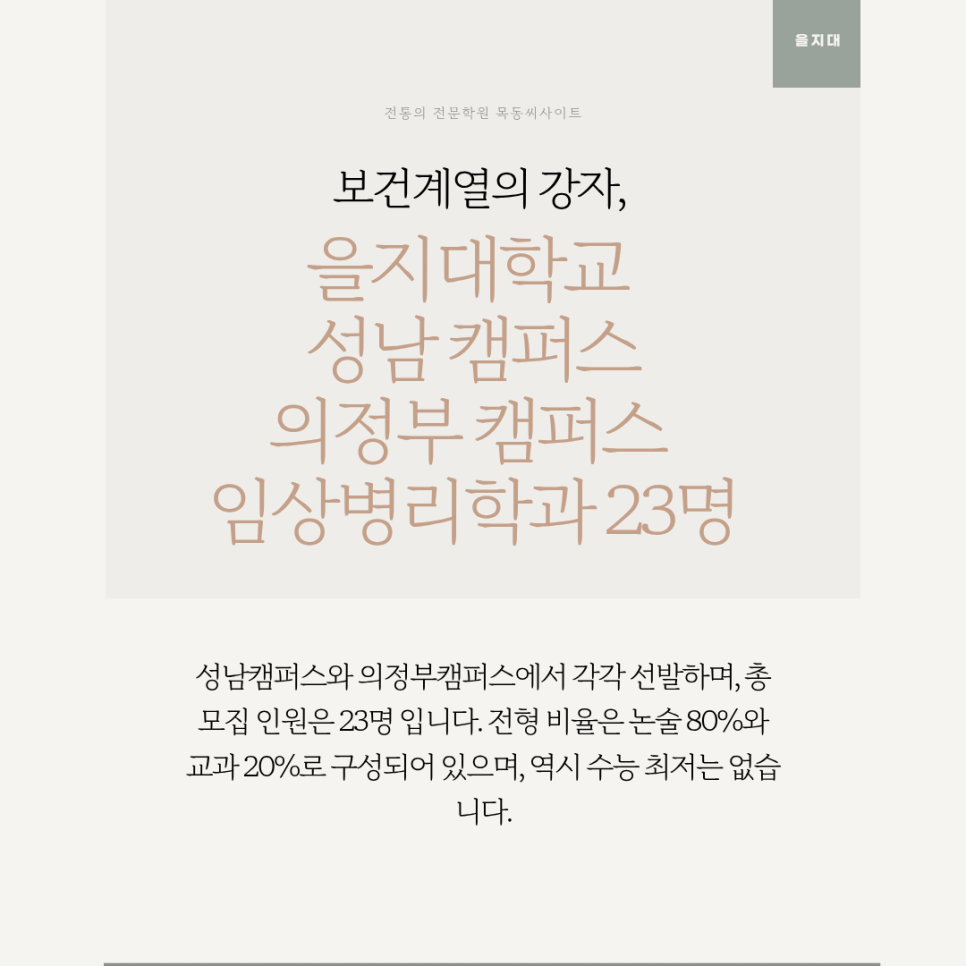 다음으로 을지대학교 임상병리학과입니다. 을지대는 과거 적성고사 시절부터 대학별 고사 운영 경험이 풍부한 학교입니다. 성남캠퍼스와 의정부캠퍼스에서 선발하며 총 모집 인원은 23명입니다. 전형 비율은 논술 80%, 교과 20%이며 수능 최저 기준은 없습니다. 지원자에게 매우 친화적인 구조입니다.